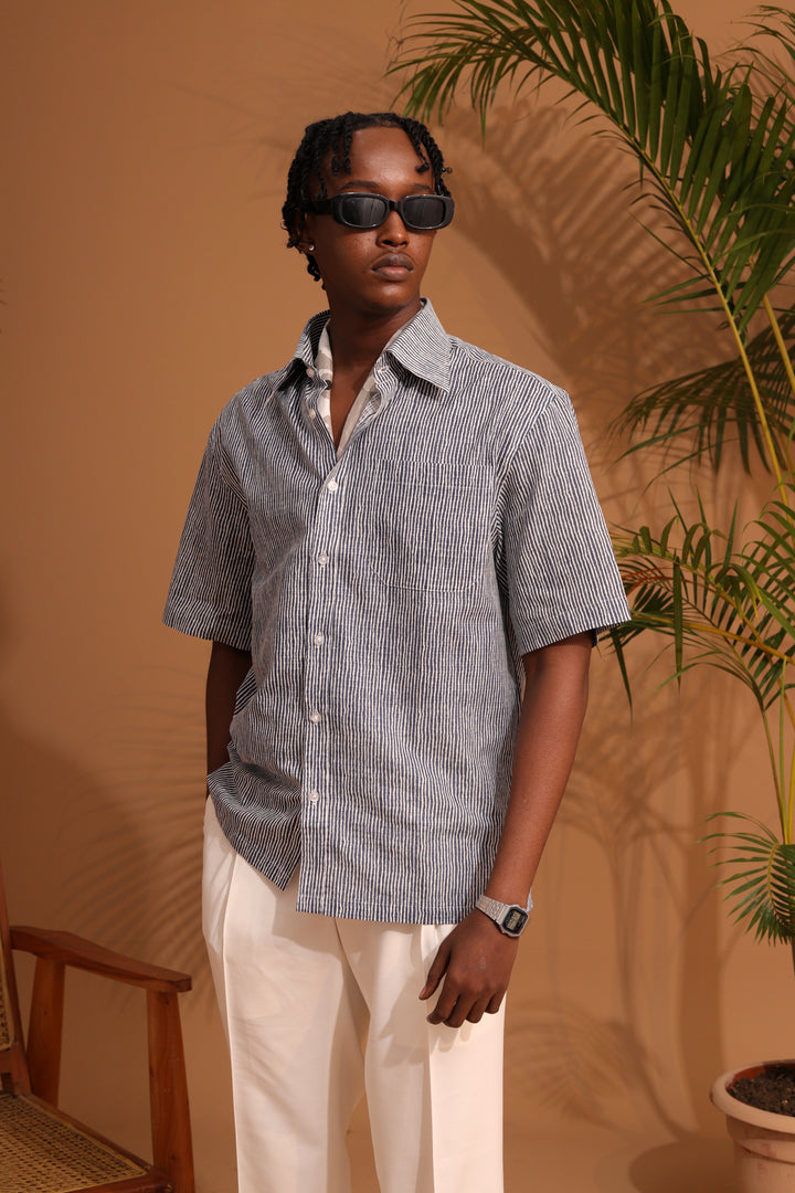 Are you looking for a casual yet stylish shirt that can go with any outfit? Introducing our Indigo Stripes Half Sleeves Oversize Shirt – where laid-back comfort meets timeless style. Embrace the relaxed elegance of this shirt, meticulously designed to redefine casual wear with a touch of sophistication.
